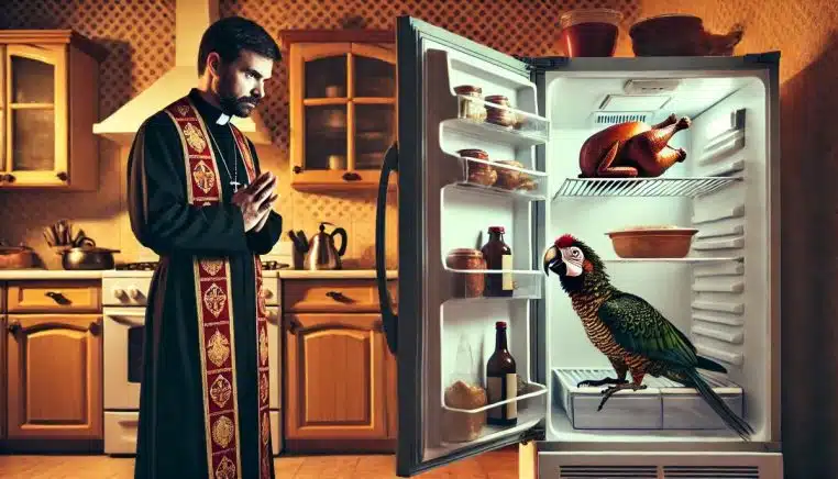 Un jour, il en a marre. Il attrape le perroquet, l’ouvre brutalement et le met dans le frigo. Silence total. Au bout de cinq minutes, le prêtre ouvre la porte. Le perroquet, tout tremblant, sort et dit d’une voix douce :