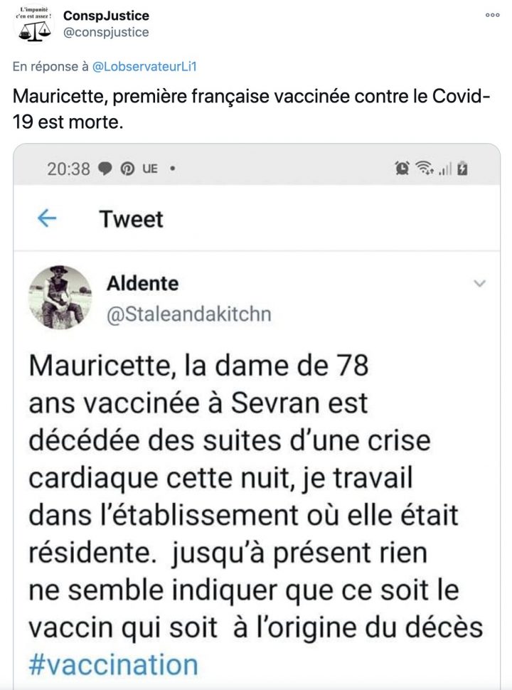 On peut lire cette triste nouvelle sur les réseaux sociaux : « Mauricette, la dame de 78 ans vaccinée à Sevran, est décédée des suites d’une crise cardiaque cette nuit, je travaille dans l’établissement où elle était résidente. Jusqu’à présent, rien ne semble indiquer que ce soit le vaccin qui soit à l’origine du décès #vaccination », relate France Info.