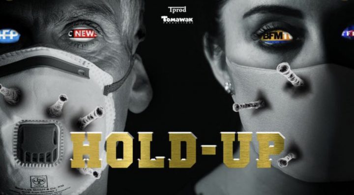 Dès l’affiche de ce film, le ton est donné. On y voit un homme et une femme, tous deux masqués, qui ont, à la place de leurs pupilles, les logos de l’AFP, CNEWS, BFMTV et TF1. À noter d’ailleurs que l’affiche a été modifié depuis. Le logo CNEWS a disparu depuis que le réalisateur de Hold-up, Pierre Barnérias, a été invité sur le plateau de « L’heure des Pros » de Pascal Praud.