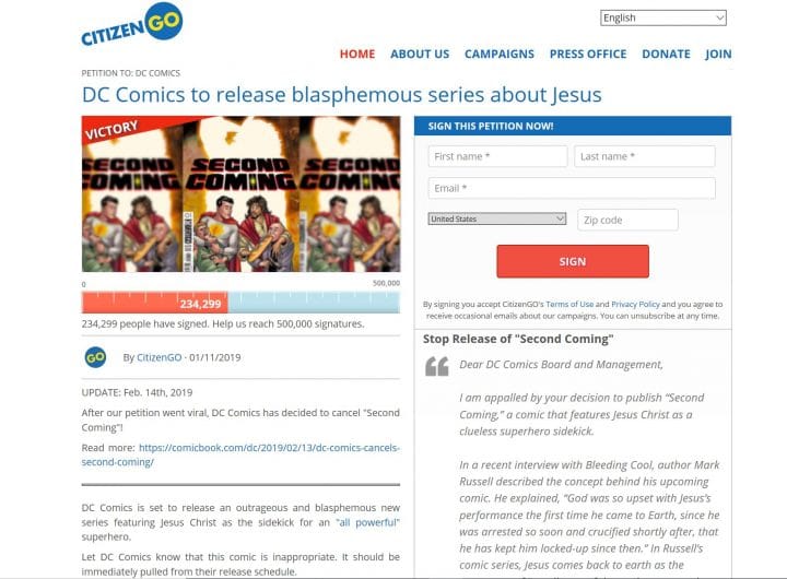 DC Comics devait publier via sa filiale Vertigo une nouvelle bande dessinée mettant en scène Jésus Christ et son retour sur Terre. Cette série satyrique écrite par l’auteur Mark Russell devait être lancée le 6 mars prochain mais elle ne verra pas le jour parmi les publications DC. Une pétition mise en ligne sur le site conservateur CitizenGo a refroidi la volonté de l’éditeur de publier cet album. Mercredi, elle avait recueilli plus de 230 000 signatures. « Ce contenu blasphématoire ne doit pas être toléré. Jésus Christ est le fils de Dieu. Son histoire ne doit pas être tournée en ridicule dans le but de vendre des comics. » explique le texte de la pétition.