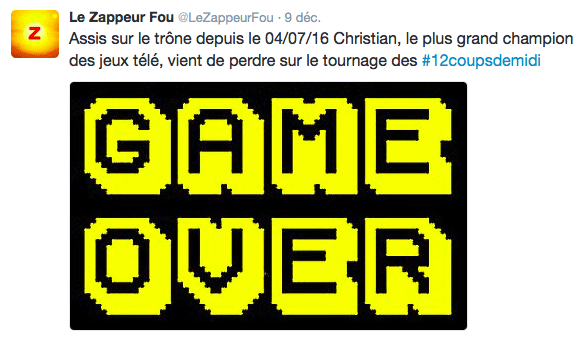 En effet, comme vous le savez depuis un moment, des rumeurs courent sur le départ de Christian dans Les 12 Coups de Midi. Après 5 mois de participation, le grand champion devrait quitter l’aventure dans 2 jours, le 14 Janvier. Du moins, ce sont les infos que révèle Le Zappeur Fou, un blogueur anonyme qui révèle des infos sur la télévision. Alors va t-on assister ce week-end à la fin du règne de Christian ? C’est possible. Comme le disait Jean-Luc Reichmann dans une interview : « La vraie quesÂtion est : est-ce qu’il va être battu ? Ou va-t-il s’arrêÂter tout seul ? Lui, son objecÂtif, c’est un million d’euros. De toute manière, tout règne a une fin. Est-ce qu’elle sera cette année, l’année prochaine, ou l’année d’après ? On n’en sait rien ! Quoi qu’il arrive ChrisÂtian va rester dans les annales de notre émisÂsion. C’est le plus grand maître de midi de tous les temps. »