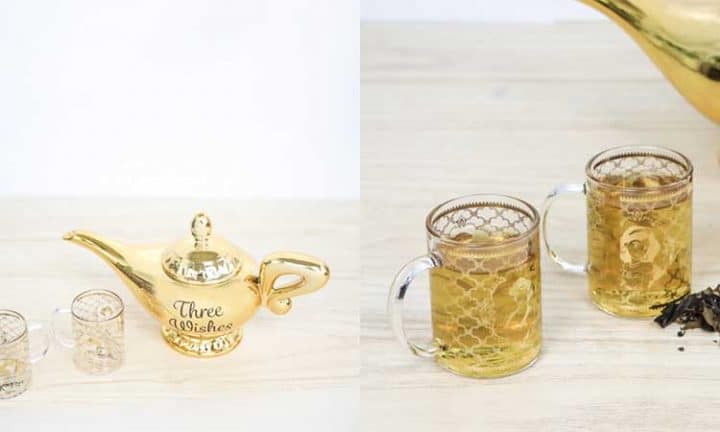 Direction Agrabah et ses senteurs orientales. Et si on s’offrait un petit thé servi dans une lampe magique ? Ce service vous est livré avec une lampe magique en guise de théière, ainsi que deux tasses à l’effigie de nos héros Aladdin et Jasmine.