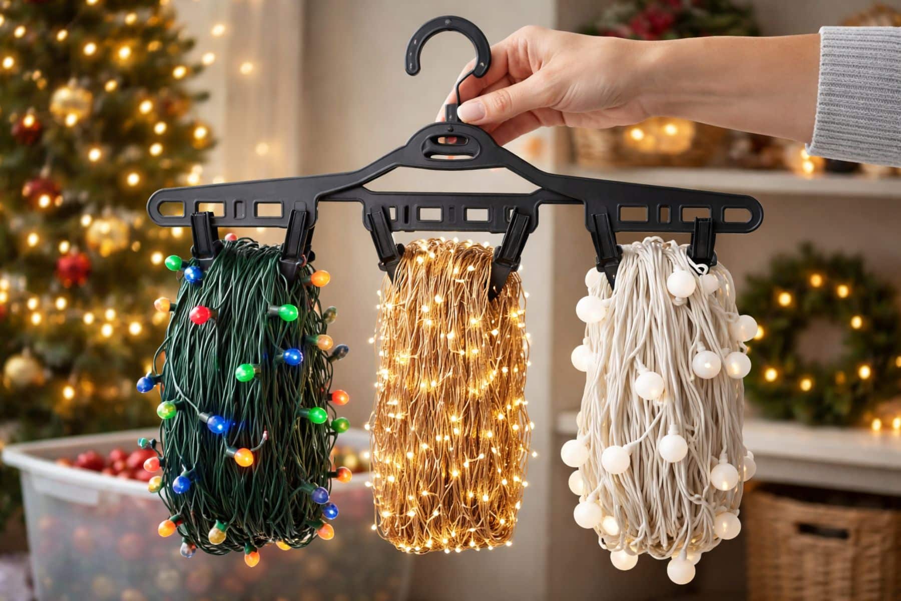 Le cintre est une astuce ménagère redoutable pour ranger les guirlandes de Noël ou de décoration sans qu’elles ne s’emmêlent. Il suffit d’enrouler la guirlande fermement autour du cintre et de fixer les extrémités avec un peu de ruban adhésif. Le cintre peut ensuite être rangé ou suspendu dans un placard. Lors de la prochaine utilisation, la guirlande se déroulera sans aucun nœud.