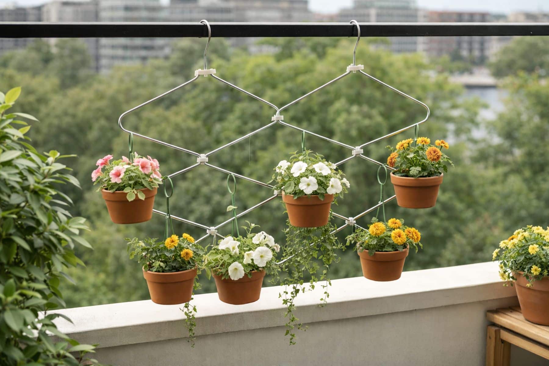 Les cintres métalliques peuvent être transformés créativement en treillis pour les plantes sur un balcon. En emboîtant deux cintres et en les fixant avec des serre-câbles, vous créez un support suspendu DIY pour pots de fleurs, parfait pour décorer un rebord de fenêtre.