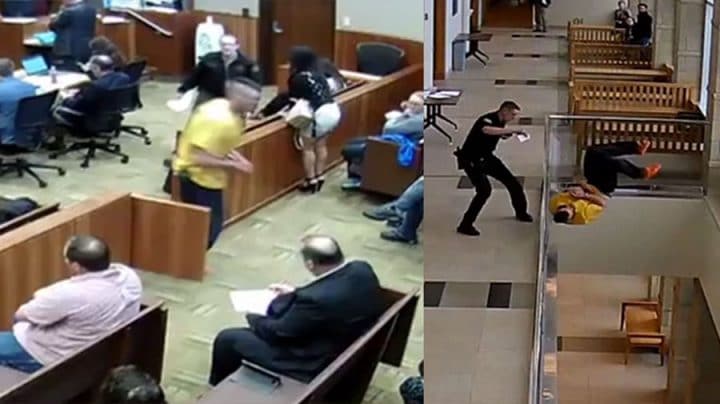 Il pensait échapper à son jugement, mais le destin en voulait autrement. Christopher Clay Rudd s’est enfui du tribunal où il était jugé pour possession d’armes et consommation de drogues. Il s’est mis à courir à toute allure, réussissant à sortir de la salle, devant ses avocats, les juges et le public présents, tous pris de court par cette tentative d’évasion. Mais il court tellement vite qu’il n’a pas le temps de se rendre compte qu’au bout du couloir… c’est un balcon. Regardez la tentative d’évasion ratée de cet homme qui va faire un vol plané de deux étages.
