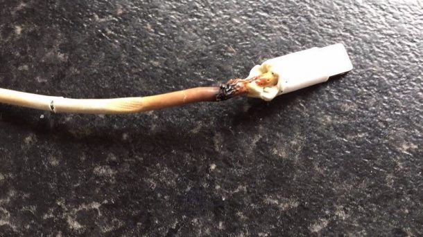 Un autre tweet montre l’état d’un faux chargeur iPhone. Comme l’indiquent les pompiers, cet utilisateur a eu beaucoup de chance, car il a trouvé son chargeur dans cet état en se réveillant, mais il n’a heureusement pas déclenché d’incendie. Imaginez ce qui aurait pu se passer si l’explosion du chargeur avait eu lieu avec le téléphone posé sur un lit. C’est justement ce qu’il s’est passé dans la troisième photo. Un utilisateur faisait charger un appareil alors qu’il était posé sur le lit. Les pompiers londoniens ont eux aussi fait savoir qu’il y avait de vrais dangers à charger son téléphone dans des conditions peu optimales. Par exemple, sur cette photo, le téléphone chargeait pendant la nuit, et l’utilisateur l’avait placé sous l’oreiller.