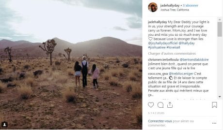 Le message écrit par Jade (ou Laeticia) sur Instagram est un bel hommage à Johnny Hallyday, mais pas seulement puisqu’il évoque aussi le mensonge et l’amour : « Mon cher papa, ta lumière est en nous, ta force et ton courage nous porteront pour toujours. Maman, Joy et moi, nous t’aimons et tu nous manques tellement tellement chaque jour. Parce que l’amour est plus fort que les mensonges ». En effet, cette publication est apparue au lendemain de l’interview de David Hallyday dans l’émission Sept à Huit, sur TF1. Une sorte de réglemente de comptes quant à l’affaire de l’héritage de leur père ? Il est fort possible que oui…
