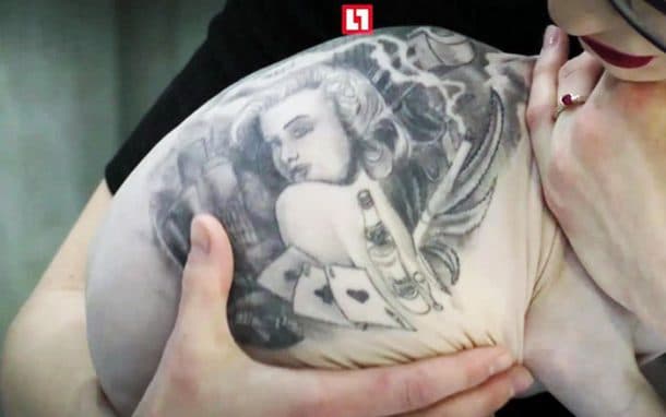 Aleksandr a voulu transformer son chat sans poil en gangster. Il a dessiné sur le dos de l’animal, une pin-up, des cartes à jouer, des tours et une cigarette. Autant de symboles utilisés par les mafieux russes en prison.