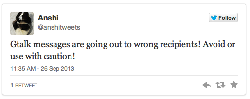 Si vous utilisez Gtalk ou Hangout pour communiquer avec vos amis, vous avez sans doute subi le bug qui touche ces messageries de Google. Les utilisateurs n’ont pas tardé à remarquer ce dysfonctionnement très fâcheux qui envoi votre message à un mauvais utilisateur, parfois même quelqu’un qui n’est pas sur votre liste de chat !