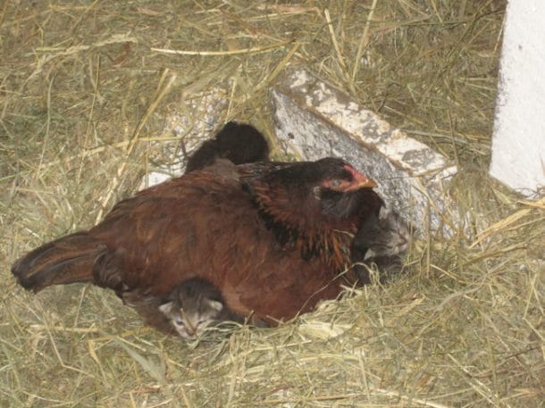 Cette poule à l’instinct très maternel couve des chatons comme ses poussins