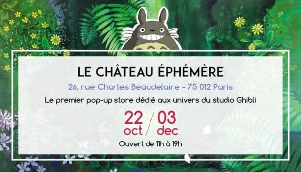 C’est une première à Paris, une boutique éphémère destinée à l’univers des films de Miyazaki va ouvrir. Elle se tiendra du 22 octobre au 03 décembre de 11h00 à 19h00 26 rue Charles Baudelaire. La boutique a été baptisée le Château Éphémère, en référence au film Château Ambulant (aussi appelé Château dans le Ciel).
