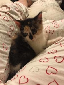 Une fois les deux poussins secourus, Moore s’est rendue dans une boutique fournissant la nourriture animale. « Dans ce magasin, il y a cette cage dans laquelle ils placent généralement poussins et canetons qui sont en vente, mais ce jour-là, ce n’était pas le cas », explique-t-elle. Dans la cage, ce jour-ci, c’est un petit chaton qui était là, et comme nous le dit Moore, « Lorsqu’elle m’a vue, elle s’est avancée dans ma direction et m’a fixée droit dans les yeux. Nous n’avions pas prévu d’avoir plus de chats, mais je n’ai pas pu m’empêcher de la prendre dans mes bras pour la réconforter. Lorsque je l’ai prise, elle s’est accrochée à moi avec ses quatre griffes. Lorsque j’ai voulu la remettre dans sa cage, je n’ai pas pu la reposer. J’ai demandé de l’aide, mais personne n’a pu non plus ! Elle m’avait choisie, ce genre de choses arrive, parfois !«