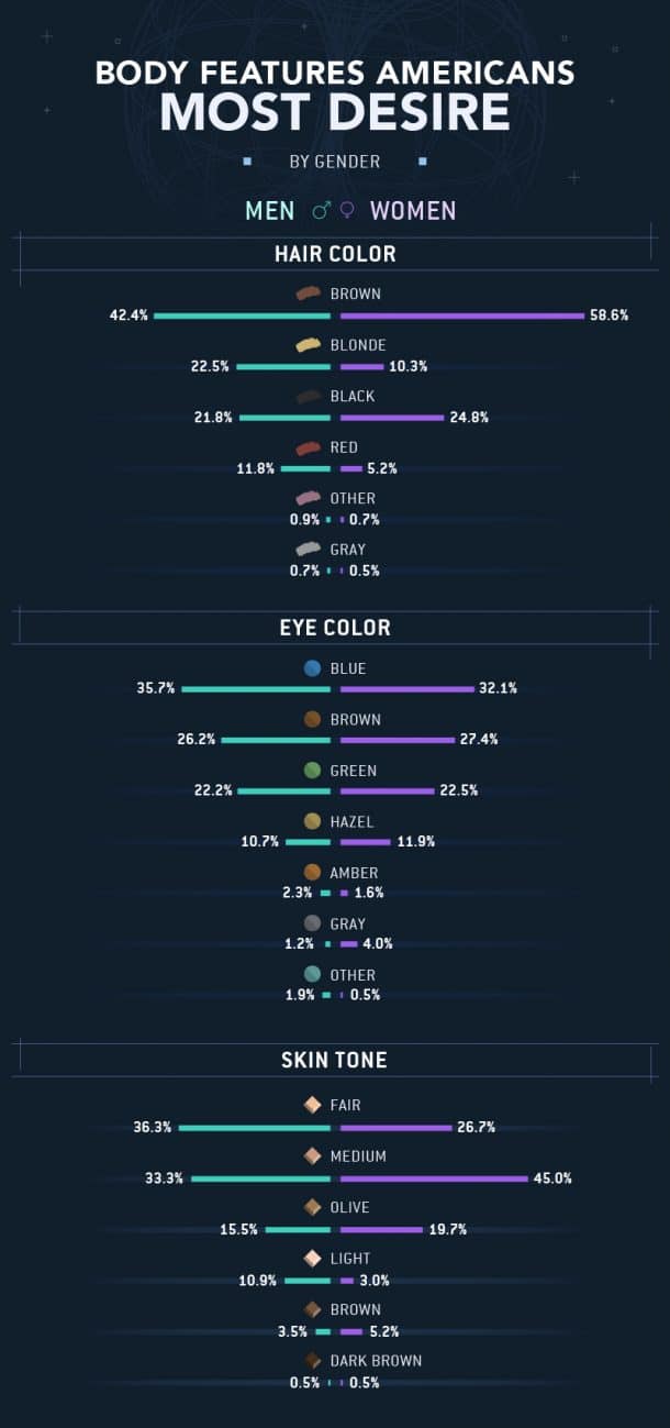 Les femmes aimeraient que les hommes pratiquent entre 6 et 8 heures de sport par semaine, selon les générations. Quant aux hommes, ils aimeraient que leur compagne en pratique 5 ou 6. La couleur préférée des cheveux pour les hommes, selon les femmes, est le brun (42,4%) contre à quasi 22% et à égalité les cheveux noirs et blonds. Les hommes préfèrent les femmes brunes à 58,6% contre 10,3% pour les blondes et 24,8% pour les cheveux noirs. Les roux et les cheveux gris sont très loin derrière. Les yeux bleus ont la cote aussi bien chez les hommes que les femmes (entre 32 et 35,7%) suivis par les yeux bruns, verts et noisette. Quant aux parties préférées par les hommes chez les femmes, le visage arrive en première position (33,3%) suivi par les fesses (21,5%), la poitrine (15,7%), les yeux (10,2) et les jambes (8,6). Au contraire, les femmes regardent d’abord chez les hommes, leur visage (33%), leurs yeux (23,7%), leurs bras (10,3%), leur torse (9,8%), leurs épaules (6,1%) et leurs fesses (4,7%).
