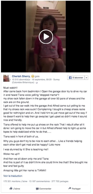 C’est une vidéo à la fois mignonne et déchirante que nous voyons ici ! Le message est profondément mignon mais fait malheureusement état de la façon dont les enfants souffrent lors des séparations. C’est Cherish Sherry, une habitante de Surrey, dans la banlieue de Vancouver qui a posté cela sur sa page Facebook le 16 Septembre dernier. Il s’agit d’une vidéo de sa fille qui lui demande de cesser les disputes avec son ex mari, le papa de l’enfant.