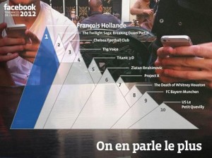 Le réseau social le plus connu au monde vient de publier un rapport sur les habitudes des internautes de Facebook France. Ainsi nous apprenons que le sujet le plus évoqué en 2012 est celui de François Hollande. Juste derrière on retrouve la saga Twilight puis le club de foot Chelsea. Chaque jour sur Facebook 2,45 milliards de contenus, plus de 300 millions de photos et 2,7 milliards de « J’aime » sont partagés. L’application musique arrivée en 2011 sur le réseau remporte elle aussi un franc succès avec 62,6 millions de morceaux écoutés 22 milliards de fois sur Facebook. Les titres les plus écoutés sont : « Ma direction » de Sexion d’Assaut puis à la deuxième place, « Call Me Maybe » de Carly Rae Jepsen et à la troisième, « Skinny Love » de Bon Iver. On retrouve encore Sexion d’Assaut à la quatrième place avec « Wati House », et à la sixième avec « Avant qu’elle parte ». La géolocalisation est la plus utilisée à Disneyland Paris, les Champs Élysées et la Tour Eiffel.