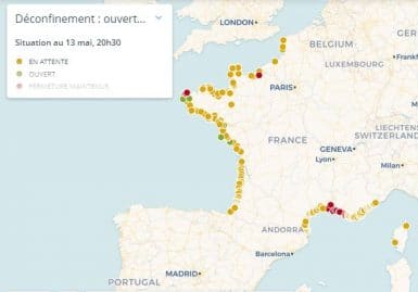 Voici la carte des plages réactualisée ce mercredi 13 mai au soir, par nos confrères de Ouest-France. En vert, les quelques plages actuellement ouvertes, en orange, les plages en attente d’autorisation. Les points rouges représentent une ouverture interdite, pour le moment.
