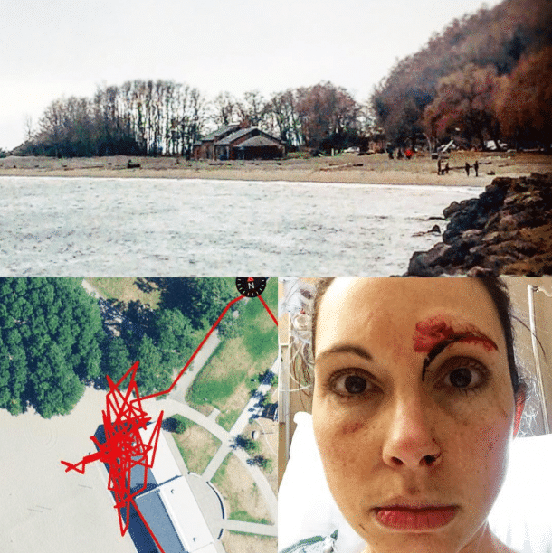 On voit les relevés GPS dans les toilettes, les toilettes dans le parc et Kelly après son agression qui s’est faite recoudre l’arcade (run_kiwi_run Kelly Herron/Instagram)