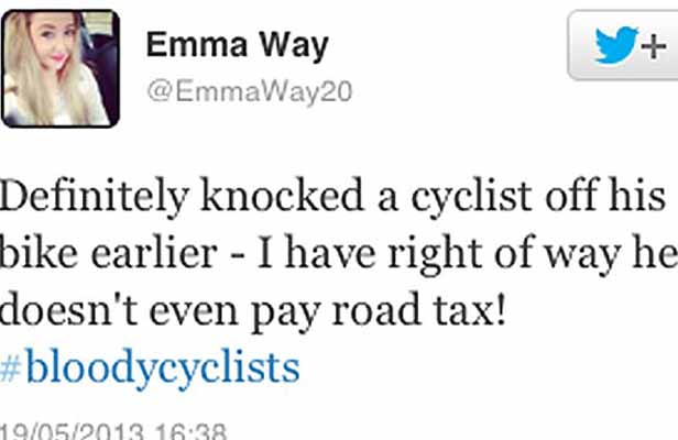 Le tweet de cette jeune femme à beaucoup circuler de l’autre côté de la manche. Après avoir renversé un cycliste dans la ville de Norwich, cette jeune femme n’a pas hésité à se vanter de son acte alors qu’elle n’a même pas daigné s’arrêter pour voir si l’homme allait bien. « j’ai renversé un cycliste tout à l’heure –j’avais le droit, il ne paie même pas la taxe de circulation! », a-t-elle déclaré sur son compte Twitter. Elle va encore plus loin en ajoutant à son tweet un hashtag #bloodycyclists (« putain de cyclistes »).
