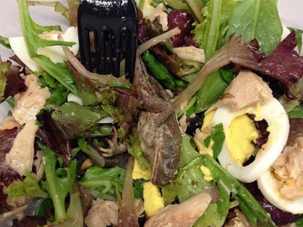 Alors on va vous couper l’appétit une bonne fois pour toute ! Cette jolie photo a été postée par Kathryn Lurie, journaliste au Wall Street Journal, à New York. Hier, alors qu’elle déjeunait avec une collègue chez Prêt-à-manger, cette dernière a découvert une jolie grenouille toute morte entre deux feuilles de salade et ses rondelles d’oeufs durs…. MIAM MIAM !