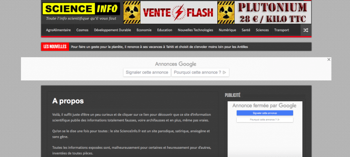 « Voilà, il suffit juste d’être un peu curieux et de cliquer sur ce lien pour découvrir que ce site d’information scientifique publie des informations totalement fausses, voire archifausses et en plus, même pas vraies. Qu’on se le dise une fois pour toutes : le site ScienceInfo.fr est un site parodique, satirique, anxiogène et sans gêne. Toutes les informations exposées sont, malheureusement pour certaines et heureusement pour d’autres, inventées de toutes pièces. »