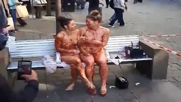 Deux copines toutes nues et couvertes de confiture à la fraise mangent sur un banc… et c’est de l’art !