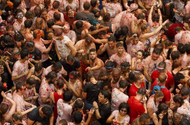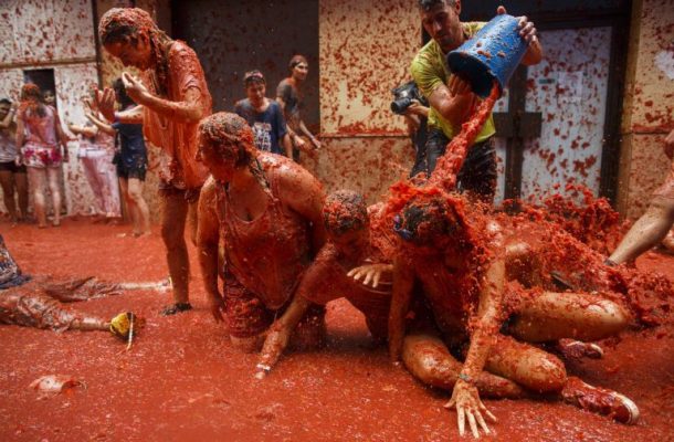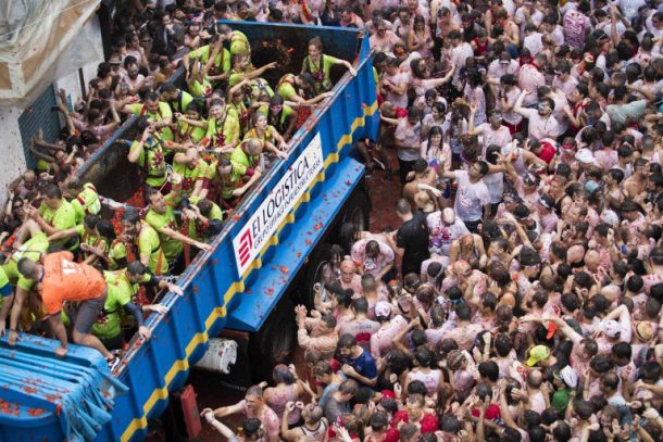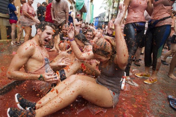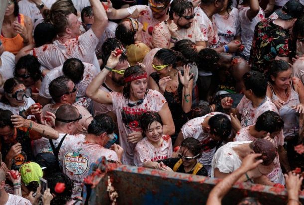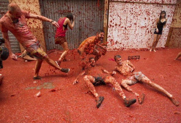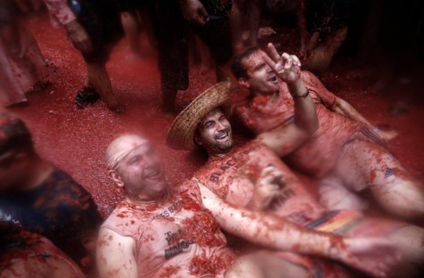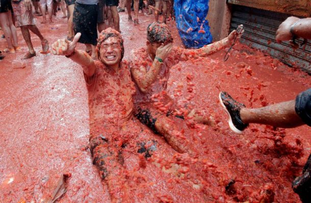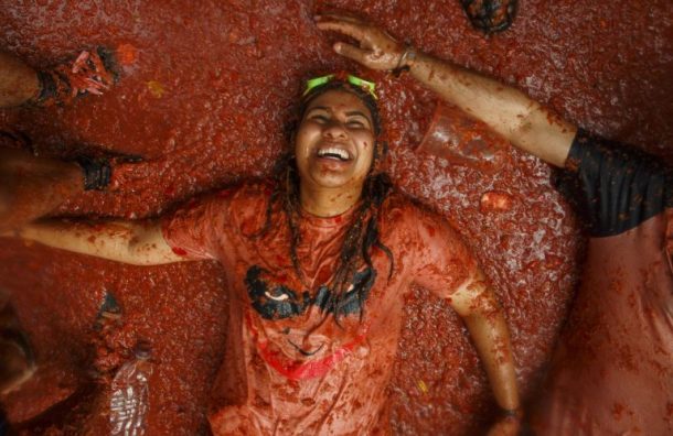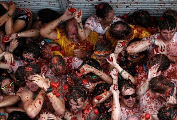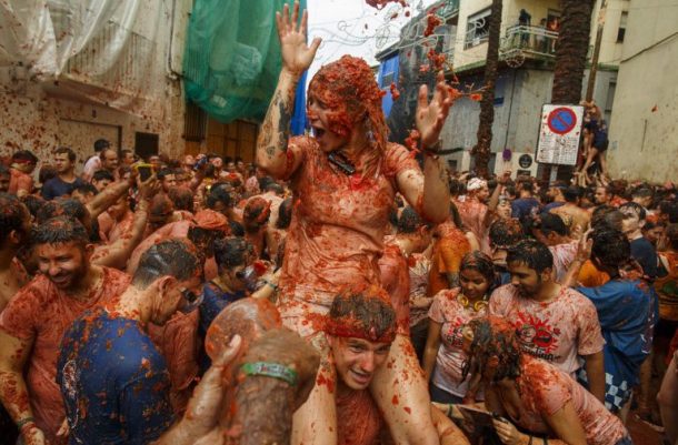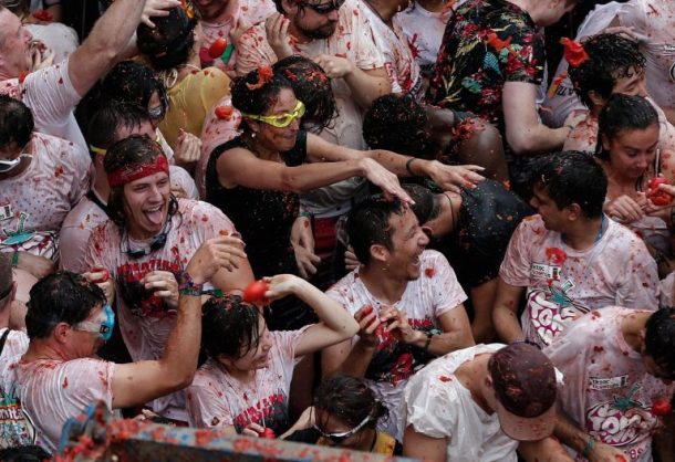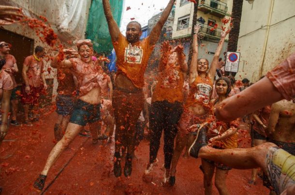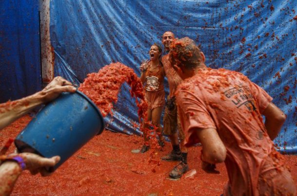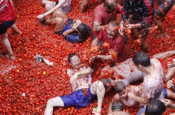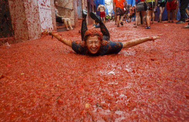 Depuis 1940, chaque année, Buñol se transforme en ville de la sauce tomate géante. Des dizaines de milliers de personnes s’y sont encore une fois rendus cette année. Plus de 160 tonnes de tomates trop mûres ont été lancées, écrasées, piétinées. D’autres ont préféré se rouler dans les fruits pressés. À voir la tête des participants, cette discipline semble jouissive. Le but n’est pas seulement de se rouler dans les tomates, tout le monde se lance des tomates dessus, comme lors d’une bataille de boules de neige. Et pour les plus agressifs, on leur balance même des seaux de mélange de tomates fraîches et de coulis. La sécurité était présente lors de l’événement, particulièrement après les tragiques événements qui s’étaient déroulés plus tôt dans le mois, à Barcelone.