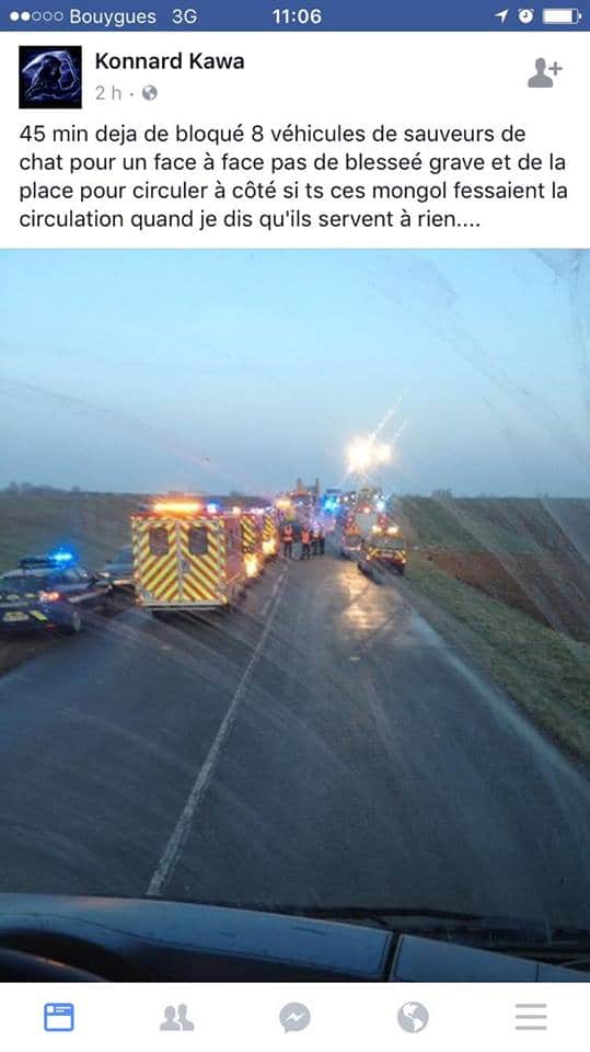 Allez, j’ose, ce Monsieur Konnard porte vraiment bien son nom. En effet, c’est le pseudo derrière lequel s’est planqué un internaute pour insulter allègrement les pompiers de l’Oise. Et tout ça, via le meilleur média qui soit, comme toujours : les réseaux sociaux. Trop facile… Mais c’était sans compter la répartie des pompiers en question. En effet, vendredi dernier, un accident impliquant deux véhicules avait nécessité l’intervention des pompiers de l’Oise. Ce qui avait eu pour effet de bloquer la route aux conducteurs durant un certain temps. Et voilà qui n’avait pas du tout plu à « Konnard Kawa », qui avait a aussitôt réagit en rendant public un message sur Twitter. Voici le dit message, accompagné de la photo :