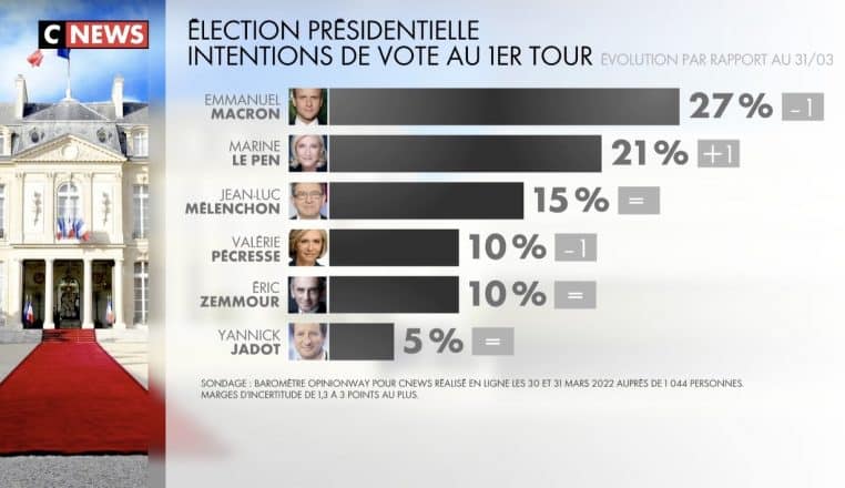 À l’inverse, Marine Le Pen serait visiblement plus proche d’être présidente qu’en 2017 ! En effet, la candidate du RN est de nouveau en hausse selon l’enquête et prend ainsi un point, atteignant 22% des voix pour le 10 avril prochain. Depuis le début de la campagne, c’est la toute première fois que l’écart entre les deux « favoris » pour le premier tour est autant serré.