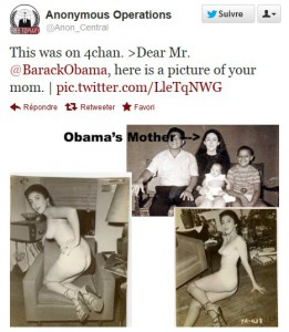 Le désormais célèbre groupe de pirates informatiques, Anonymous, a encore fait des siennes et s’est attaqué cette fois au président Américain, Barack Obama. Ils ont posté un message sur Twitter accompagné de trois photos en noir et blanc qui datent des années 50. Ce message disait : « cher M. Barack Obama, voici une photo de votre mère ». Le collectif insinue que la femme sur les photos est la mère d’Obama, Ann Dunham. Le problème est que la femme sur les photos est nue.