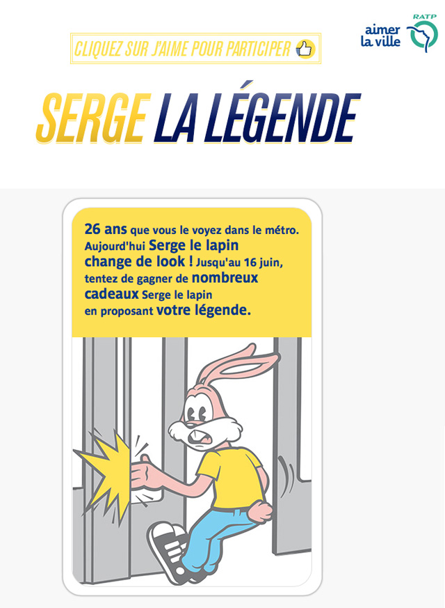 A l’occasion du relooking du plus célèbre lapin du métro, la RATP vous offre la possibilité de créer votre propre lapin et son slogan! Si vous gagnez, il pourra être affiché dans tous les métros parisiens! Il s’agit de lui refaire une jeunesse ! (il est dans les métros parisiens depuis les années 70 quand même!) Le générateur « Serge le lapin » va vous permettre de créer votre propre petit lapinou! Tentez votre chance, de nombreux lots sont à gagner (tee-shirts, coques pour smartphones, kit de secours)!