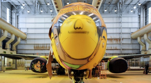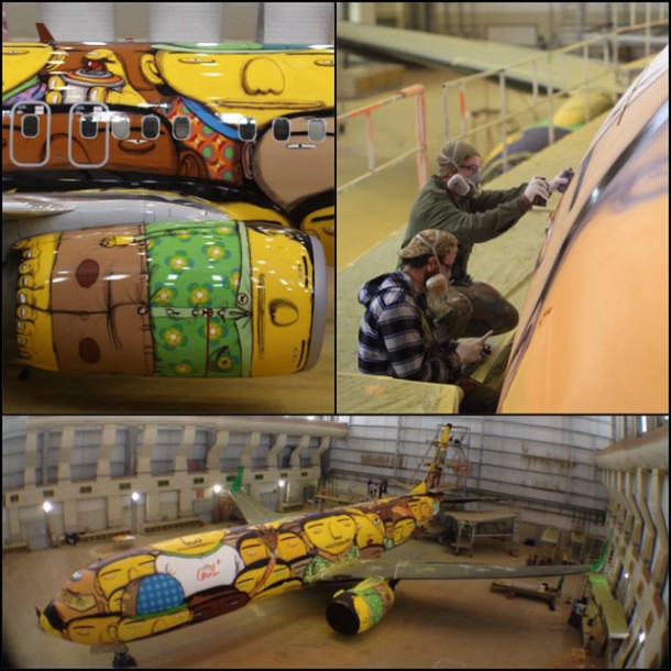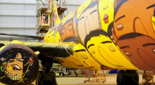 Rien n’est trop beau pour l’équipe accueillant la Coupe du Monde 2014! La preuve: son avion officiel à été complètement repeint aux couleurs du Brésil! Les deux frères graveurs Os Gêmeos ont utilisé plus de 1200 bombes de peinture pour repeindre entièrement l’avion! C’est une fresque gigantesque représentant les différents visages du Brésil! Cet avion customisé transportera les joueurs et le staff pendant la Coupe du Monde.