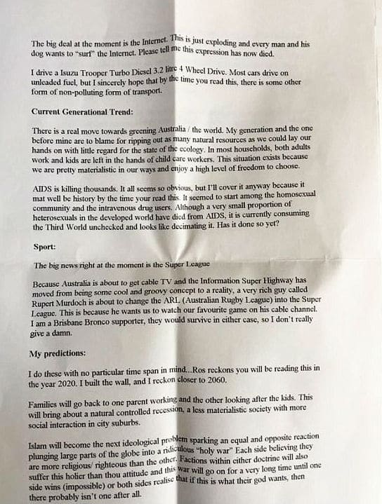 Dans le début de sa lettre, il explique sa vie. Il raconte quand et comment il a acheté cette maison. Il joint également une photo de lui et de Roslyn Green. Puis, il donne la valeur de quelques produits du quotidien. Par exemple, un journal coûtait 1,20$ et l’essence était à 0,68$/litre (les valeurs étant en dollars australiens). Il rappelle aussi le contexte politique dans lequel ils se trouvaient en 1995. Il parle de Paul Keating, Premier ministre indépendantiste, ou de l’ordinateur sur lequel il a écrit cette même lettre. Il a utilisé Word pour Windows V5.0 sur un ordinateur portable de 8MB de RAM et avec une capacité de disque dur de 240 MB. Ce qui représente la capacité d’une petite clé USB de nos jours, puisqu’un ordinateur standard tourne autour de 8 GB de mémoire vive pour un disque dur de 320 GB.