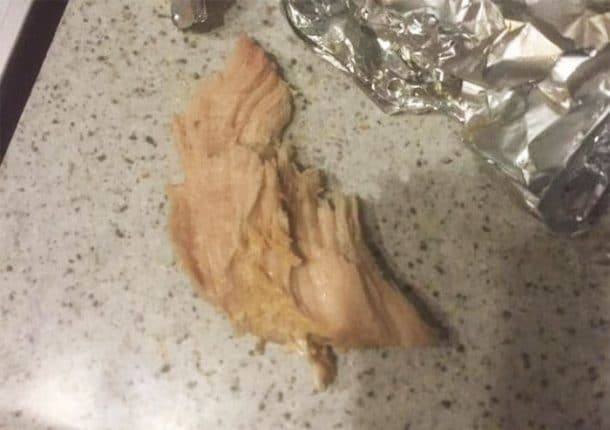 En effet, le soir du réveillon de Noël, cette petite chienne s’est faufilée dans la cuisine avant l’arrivée des invités. Et elle s’est tapée la dinde… Alors on parle quand même d’une dinde qui était presque aussi grosse qu’elle… D’ailleurs, Bubba n’a même pas pu la finir et elle en a laissé un petit morceau…. tout petit…. que voici…