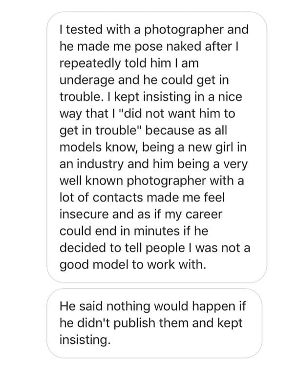 Cameron Russel, un mannequin engagé, a décidé de jeter un pavé dans la mare et de faire connaitre la vérité sur les coulisses des défilés et des shootings glamours. Elle a décidé de publier les messages d’autres mannequins qui l’ont contactée et qui ont décidé de témoigner anonymement. C’est d’abord une amie qui l’a contactée pour dénoncer les abus qu’elle a connus. Cameron a publié sur Instagram les captures d’écran de la conversation. « Salut Cameron, merci beaucoup pour ta réponse, ça compte beaucoup pour moi. Le nom du photographe est XXXX, il a un compte Instagram qui porte le même nom. XXXX m’a envoyé chez lui pour un test à 15 ans. Ma belle-mère était avec moi durant le shooting, mais dans une autre pièce. Elle n’a aucune idée qu’il a enfoncé ses doigts profondément dans mon vagin. Il l’a fait à plusieurs reprises alors qu’il prenait des photos de moi, en me disant que ça rendrait les photos plus sensuelles. Il a fait ça à une fille de 15 ans ».