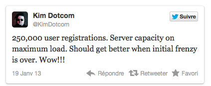 A moins de 24h après l’ouverture du site Mega disponible à l’adresse mega.co.nz en version beta, petit bilan par Kim Dotcom lui même : plus de 250 000 membres inscrits en moins de 2 heures et un site plus que saturé par le nombre de tentatives de connexion.
