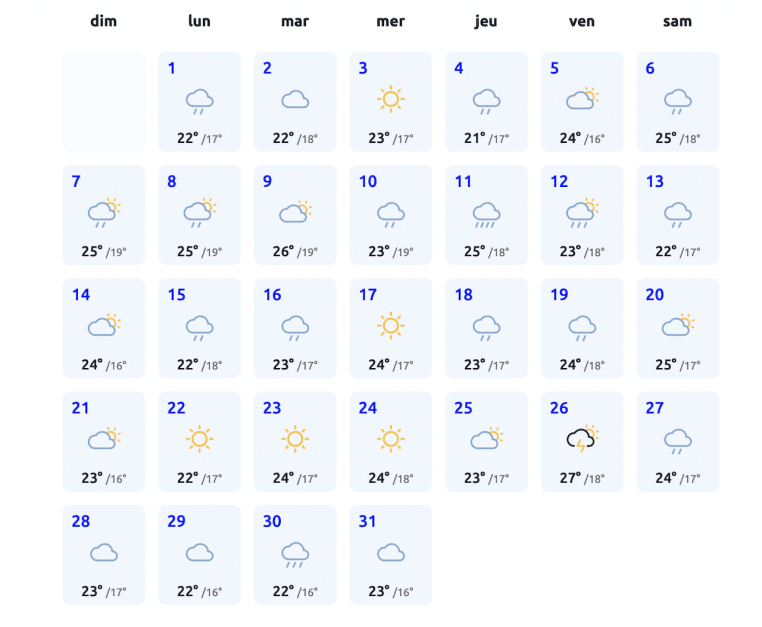 Par contre, ce n’est pas le même constat en Nouvelle-Aquitaine. En effet, les prévisions météorologiques donnent 6 à 9 jours de pluie. Des villes comme Biarritz auront des températures maximales de 26°C avec seulement 5 jours ensoleillés en ayant le ciel dégagé.