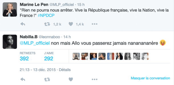 Avec 1,85 million d’abonnés sur Twitter, Nabilla ne passe pas inaperçu sur le réseau social et hier soir, c’est un tweet sur les élections régionales et plus particulièrement sur le FN qui a fait mouche… Nabilla a en fait même répondu directement à un tweet de Marine Le Pen !