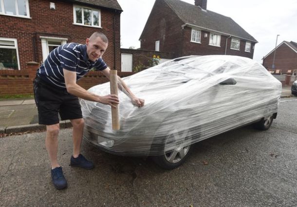 « J’ai trouvé que c’était de la provocation de laisser la voiture là, donc j’ai pensé qu’il fallait leur faire une petite surprise ». Il s’est rendu au supermarché et il a commencé à enrouler le véhicule d’un film cellophane, à l’aide d’un énorme rouleau de film industriel. On n’aurait aimé voir la tête de la propriétaire en découvrant sa voiture à l’allure d’une mini-œuvre de Christo.