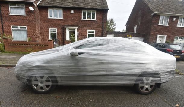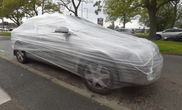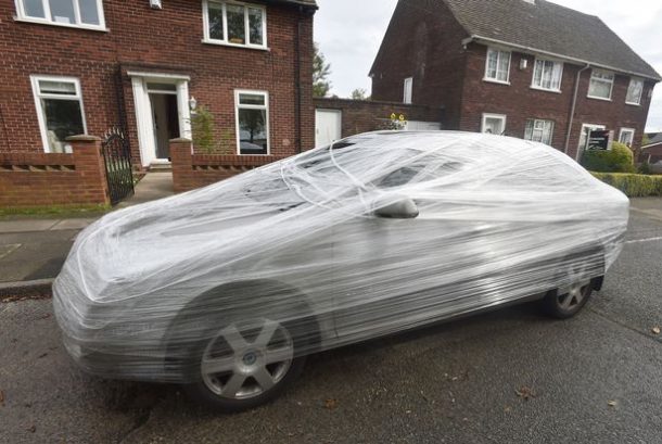 On ne savait pas qu’il y avait pire surprise qu’une contravention sur le pare-brise… Pourtant, si ! Imaginez, vous rentrez de vacances… Vous êtes encore la tête dans les nuages, terrifié par la météo grise alors qu’il y a quelques heures à peine vous vous promeniez en t-shirt sur la plage. Vous êtes épuisé par les heures d’attentes à l’aéroport, puis le vol exigu avec cette compagnie low cost. Vous prenez un taxi et vous retrouvez votre voiture, elle est garée là où vous l’aviez tranquillement laissée le temps de vos vacances. Sauf que votre voiture est bloquée. Cette femme a retrouvé sa voiture enrubannée dans de la cellophane. Essayez d’imaginer l’horreur pour arracher le film plastique qui colle sur sa voiture… Que lui est-il arrivé ?