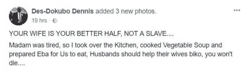 Dans sa publication, Des-Dokubo Dennis écrit un message très encourageant : « Votre femme est votre meilleure moitié, pas une esclave… Madame était fatiguée, alors j’ai repris la cuisine, cuisiné la soupe aux légumes et préparé Eba pour que nous puissions manger, les maris devraient aider les femmes Biko, vous ne mourrez pas ».