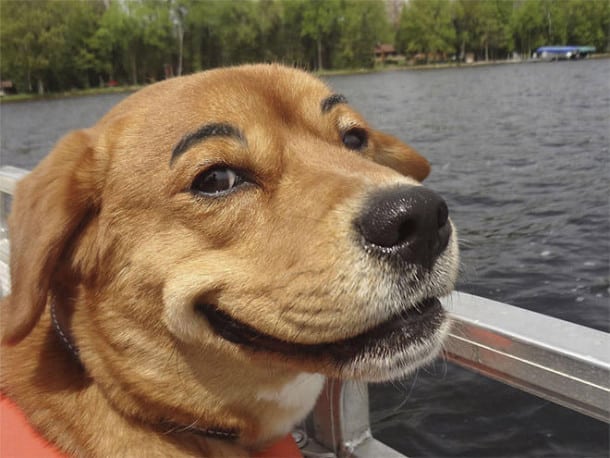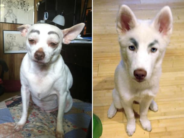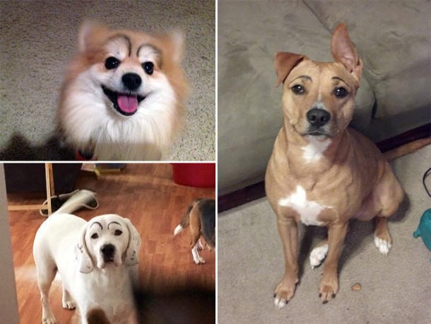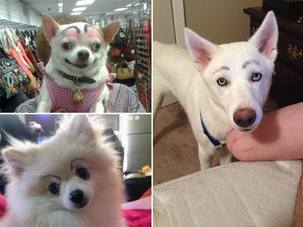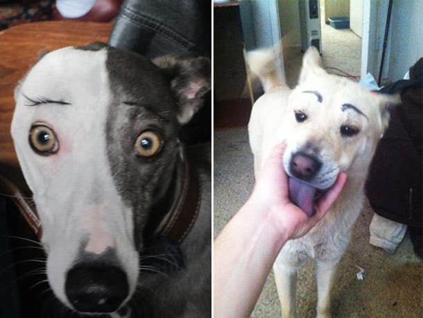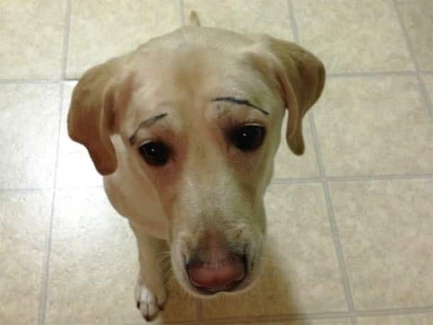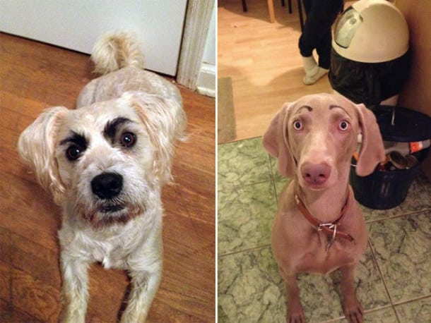 Nos pauvres toutous ! On peut lui faire faire les pires âneries, ils se laissent faire sans broncher. Serait-ce leur manière de nous dire qu’ils nous aiment, malgré nos pitreries ? Regardez à quoi ressembleraient nos chiens avec des sourcils ! Hilarant !