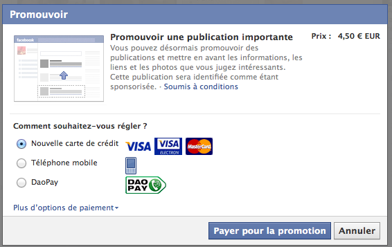 Après avoir dépassé le cap du milliard d’utilisateurs actifs (voir ICI), le réseau social Facebook lance une nouvelle fonctionnalité destinée cette fois-ci aux particuliers. Déjà disponible en Nouvelle Zélande depuis le mois de mai et depuis le début du mois d’octobre aux USA, cette fonctionnalité permet désormais aux particuliers de faire sur leur page, la promotion d’une publication. Statut, photo, événement etc…, pour 4,5€, Facebook vous propose désormais d’offrir une plus grande visibilité aux posts que vous choisissez de promouvoir. Cela s’appelle le post sponsorisé.