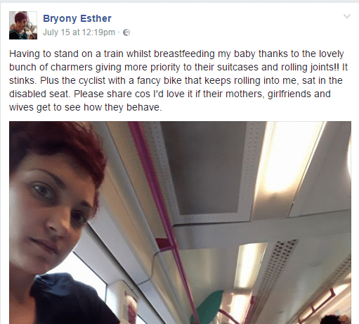 Sous la photo qu’elle a partagée sur Facebook, Bryony Esther a écrit : « Obligée de me tenir debout tout en donnant le sein à mon bébé dans un train, à cause d’une bande de gentlemen qui donnent priorité à leurs bagages et préfèrent se rouler des joints ». Comme elle le précise, il y a aussi un cycliste qui apparait derrière elle et qui en plus de l’importuner avec son vélo, a pris la liberté de s’asseoir sur une place réservée aux handicapés.