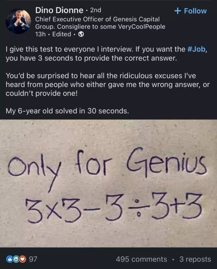 Bien entendu, un bon nombre de personnes ont dû échouer à résoudre le casse-tête. Cela peut découler de la pression, du stress, ou bien elles n’aiment tout simplement pas les maths. Le titre de l’énigme est « Only for Genius », ou réservé aux génies. Il propose simplement de résoudre l’équation « 3×3-3÷3+3 ». Vous pensez pouvoir trouver la réponse dans le temps imparti ?