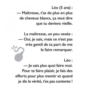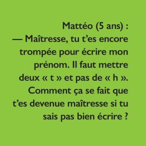 Phrases choc, erreurs de vocabulaire et autres lapsus révélateurs, les enfants sont toujours aussi drôles et leurs échanges le sont parfois encore plus. Dans les 20 images ci-dessous, vous allez pouvoir découvrir un bel extrait du tome deux de « Maîtresse », la collection de livres de Michèle Guérin dans laquelle vous retrouverez absolument toutes les perles qu’elle et ses collègues ont récoltées au fil des années.