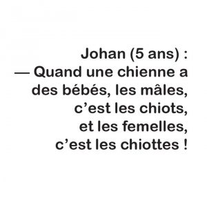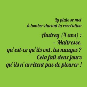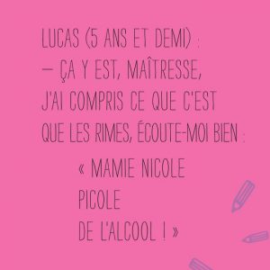Si vous avez déjà rencontré un enfant en bas âge, ou si vous en avez vous même été un, vous le savez forcément : ils n’ont pas la langue dans leur poche, et s’ils commencent à avoir l’âge nécessaire pour parler comme des grands, ce n’est pas toujours si facile, et ça dérape souvent en catastrophe. Institutrice depuis près de trente ans, Michèle Guérin a eu une idée de génie en commençant à compiler les « perles » des enfants de son école.