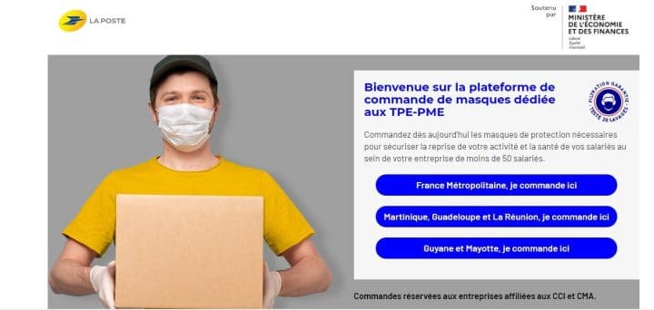 Depuis le 2 mai, La Poste a mis en place une plateforme masques-pme.laposte.fr pour permettre au TPE et au PME de moins de 50 salariés de commander des masques lavables. C’est plus précisément Docaposte, la filiale numérique de La Poste, qui a mis en place ce système. Elle possède un stock de départ de 10 millions de masques textiles aux normes AFNOR. Ils sont lavables et réutilisables 20 fois. Cette plateforme est destinée à favoriser la reprise de l’activité économique en respectant les recommandations sanitaires. 30 000 entreprises ont déjà passé commande de 1,3 million de masques.