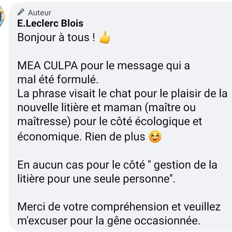« Bonjour à tous ! MEA CULPA pour le message qui a mal été formulé. La phrase visait le chat pour le plaisir de la nouvelle litière et maman (maître ou maîtresse) pour le côté écologique et économique. Rien de plus. En aucun cas pour le côté « gestion de la litière pour une seule personne ». Merci de votre compréhension et veuillez m’excuser pour la gêne occasionnée » .