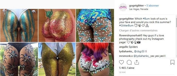 Mais cette fois-ci, ce nouveau look nous vient de Go Get Glitter, la célèbre marque de cosmétique. L’équipe est à l’origine du glitter butt ou comment se peinturlurer le postérieur façon glossy. Une tendance devenue très à la mode cet été dans de nombreux festivals. Une culotte en paillettes sirène, un legging intégral en paillettes dorées, ou encore une pomme à croquer… Il n’y a aucune limite à notre imagination !