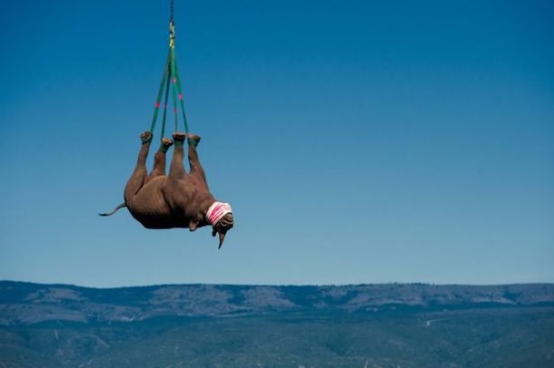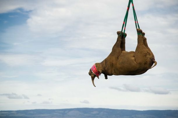 C’est une série de clichés rares que vient de publier le photographe britannique Pete Oxford. Un rhinocéros tracté par un hélicoptère en Afrique du Sud. Le photographe vit et travaille dans le Parc national et s’intéresse aux photos d’environnements naturels. Il lui a été confié une mission particulière, capturer ce moment unique. Voir l’animal d’une tonne, accroché par les quatre pattes et pendu dans les airs est vraiment incroyable. Sur ces images spectaculaires, on y voit le rhino qui vole dans ce ciel azur. Il traverse la Great Fish River Reserve, en Afrique du Sud, suspendu à un hélicoptère Robinson 44.